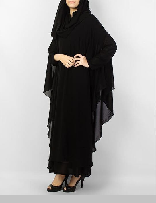 Black double-layer best and simple abaya latest design in Pakistan, abaya which is in fashion and the latest abaya trend in Pakistan is the black layer double piece abaya for women for university and college ladies and female student abaya at best and cheap price abaya in Pakistan.
